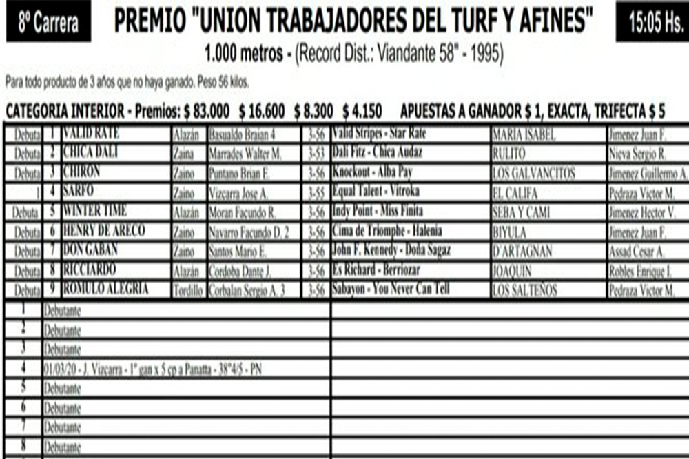 La jornada, primera desde marzo en ese hipódromo, dará comienzo a las 11 y se extenderá hasta las 18.10. En la competencia que honra a la UTTA fueron inscriptos nueve productos, ocho de ellos debutantes absolutos y el otro, el potrillo Sarfo, un ganador no computable en 700 metros. Esta vez, el desafío será en 1000 metros, con el representante del stud El Califa midiéndose ante una potranca (Chica Dali, de la caballeriza Rulito) y otros siete potrillos: Valid Rate, de las sedas María Isabel; Chirón, de Los Galvancitos; Winter Time, de Seba y Cami; Henry de Areco, de Biyula; Don Gabán, de D’Artagnan; Ricciardo, de Joaquín, y Rómulo Alegría, de Los Salteños. El premio al vencedor previsto es de 83.000 pesos.