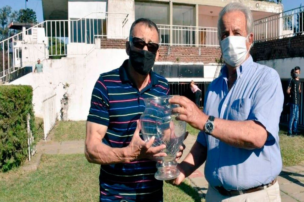 Luis Leguiza, Secretario Tesorero de la Unión de Trabajadores del Turf y Afines, recibió una preciosa copa de cristal de manos de Hugo Iturraspe, vicepresidente de la Sociedad Rural de Santa Fe, en representación del Jockey Club de la provincia. Como se sabe, Felice lideró desde nuestra Unión el acompañamiento en la presentación de protocolos y pedido de reaperturas de cada uno de los hipódromos y Jockeys Club provinciales.
