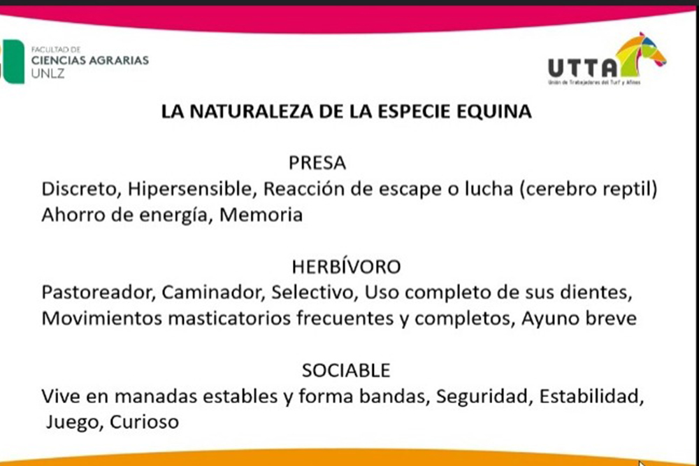 Con récord de inscripciones, el miércoles se vivió con gran interacción el curso “Etología aplicada al manejo y entrenamiento del caballo”, brindado por la Unión de Trabajadores del Turf y Afines (UTTA) en el marco del convenio de colaboración celebrado con la Universidad Nacional de Lomas de Zamora - Facultad de Ciencias Agrarias, suscripto el pasado jueves 22 de junio.