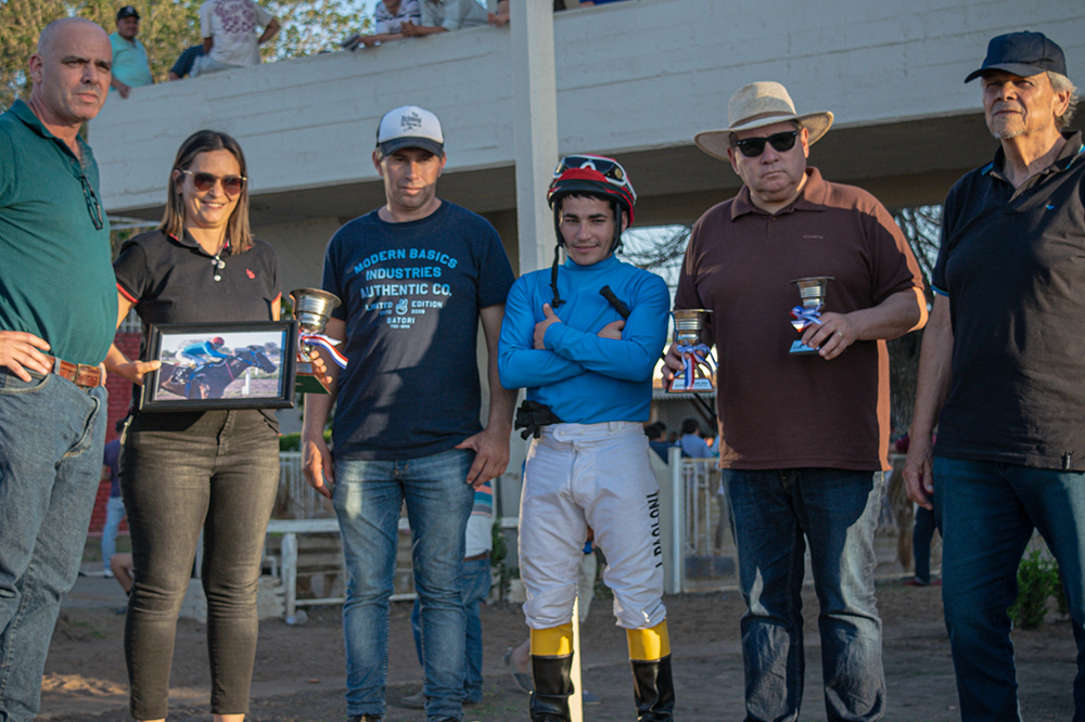 Stefanía Felice, nuestra Secretaria de Prensa, Acta y Cultura, y Ricardo Solaro, el Secretario Adjunto, entregaron los trofeos al jockey Juan Paoloni, al entrenador Cristian Millares y a todo el equipo del stud Javi, propietario de la yegua que prevaleció por tres cuartos de cuerpo al cabo de 56”95/100 para los 1000 metros.