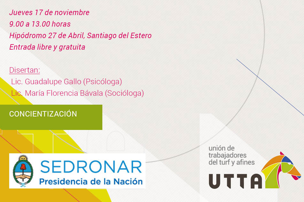 La Unión de Trabajadores del Turf y Afines junto a la Secretaría de Programación para la Prevención de la Drogadicción y la Lucha contra el Narcotráfico organizaron para el jueves 17 de noviembre, en el Hipódromo de Santiago del Estero, una jornada de Sensibilización sobre el Consumo Problemático de Sustancias Psicoactivas. La entrada será libre y gratuita.